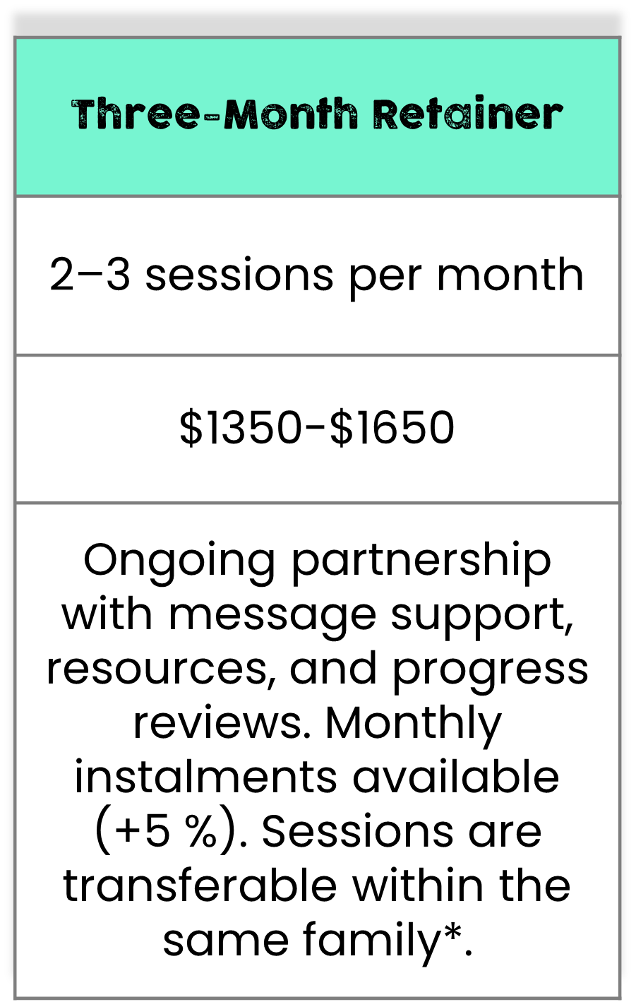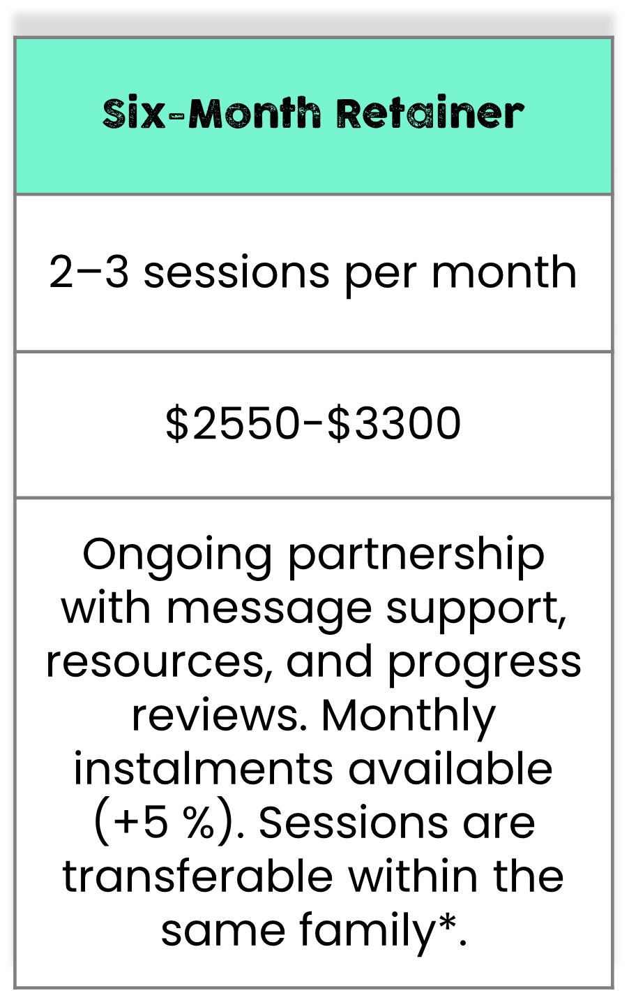 Real growth takes consistency. Our retainers offer structured accountability and support between sessions so progress continues long after the first breakthrough.
